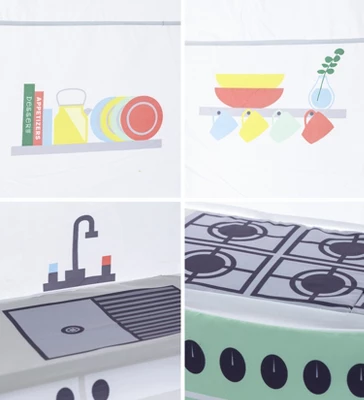 Baste, broil, bake, and braise…calling all junior chefs and aspiring entrepreneurs to cook up imaginative play with our Kitchen Playhouse Tent and Cooking Set! The roomy 44″L x 44″W x 50″H polyester play tent with sturdy plastic poles gives kids their own space to play and “cook” alongside mom or dad. The retro-colored fabric appliances, colorful floor, and mint-green scalloped roof and trim will complement a playroom, bedroom, or family room. Tie-back doors and open windows offer plenty of light and air while they play.The back wall of this play tent features a shelf for kids to mix up their pretend ingredients. Doors below the refrigerator and stove remove with hook and loop tape, and offer plenty of storage space for kitchen utensils and toys (not included). Burners, sink, faucet, and other kitchen details printed on the interior of the tent add even more character.Set includes 7-Piece Jr. Chef’s Cooking Set (pot and pan with lid, whisk, spoon, spatula, and rolling pin).Perfect gift for kids who love pretend play and role-play. Adult assembly required.