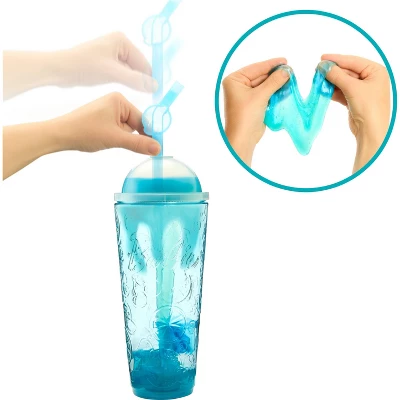 - Kids remove the outer layer of packaging, open the cup and pull out the surprise bags, then screw the lid back on and pop the top with the straw-like piece to release squishy, blue Slime over the ice cubes!