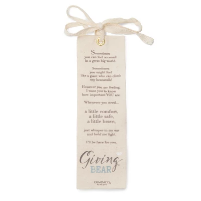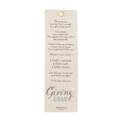 A special friend. This precious fellow comes with an endless supply of hugs, the perfect gift of comfort and love. More than just any stuffed animal, our special Giving Bear is designed to be given to someone, young or young at heart, who needs comforting. The friendly companion sits 12 inches tall and is lightly stuffed to form his floppy body. Soft touchable fabrics lend soothing comfort and love. His contrasting corduroy ear shows he is a good listener. Includes a special bookmark that carries his message: Sometimes you can feel so small in a great big world. Sometimes you might feel like a giant who can climb a beanstalk! However you are feeling, I want you to know how important YOU are. Whenever you need a little comfort, a little safe, a little brave, just whisper in my ear and hold me tight. I’ll be here for you. DEMDACO Giving Bear is a special companion to remind the recipient that a friend is always near. Plush, Measures 16 Inches Sentiment: Bookmark hangtag: Sometimes you can feel so small in a great big world. Sometimes you might feel like a giant who can climb any beanstalk! However you are feeling, I want you to know how important YOU are. Whenever you need… A little comfort, a little safe, a little brave, just whisper in my ear and hold me tight. I’ll be here for you.
