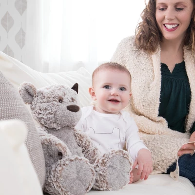- The friendly companion sits 12 inches tall and is lightly stuffed to form his floppy body. Soft touchable fabrics lend soothing comfort and love. His contrasting corduroy ear shows he is a good listener.