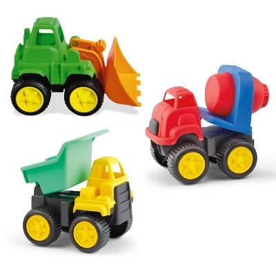 - Product Specifications: Package includes (3) colorful construction vehicles with real working parts: dump truck, cement mixer and a bulldozer. Recommended for ages 12 months and older.