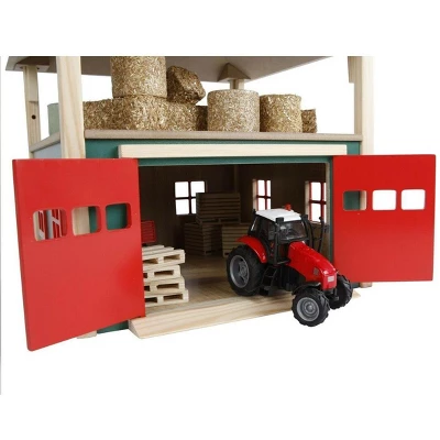 Produced by Kids Globe, this is a 1/32 scale wooden hay barn with loft and adjustable roof. This is a great addition to any little farmer’s toy collection. Pictured equipment and accessories not included! The barn measures approximately 12.6″L x 13.8″W x 17.7″H. Per the manufacturer, this item is recommended for ages 3 years and up.