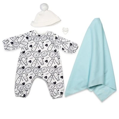 Comes with a long-sleeved jumpsuit, knit cap with a large pompom, swaddling blanket, and a magnetic pacifier.