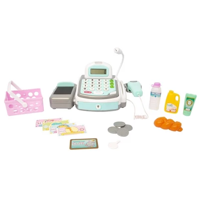 It’s an easy grocery market checkout with the Perfectly Cute Home Super Market Cash Register! Mindfully designed for imaginative & nurturing pretend-play, you little ones will have so much fun scanning items with the hand held scanner and totaling up groceries with the real working calculator. Set comes complete with play money, swipe-able credit card, locking cash drawer with key & more! Durable & easy-to-wipe clean. Batteries included.