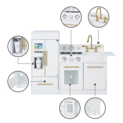 Help your little one create gourmet meals of their own with the Teamson Kids Little Chef Charlotte Modern Kids Kitchen Playset. This contemporary play kitchen is designed with a classic white look and gold accents, making it great for both boys and girls, and it completes any home, classroom, preschool, or daycare playroom. The functional design of this play kitchen includes opening oven and refrigerator doors, 4 turning oven knobs, 2 oven burners, a freezer with an ice maker, a sink, and an under-sink cabinet to make playtime more realistic. With charming details including a cup with ice cubes, a clock, and dials, this kitchen set sparks your little chef’s imagination. The eco-friendly MDF construction of this pretend play set is kid-safe and easy to clean for easy upkeep. Included step-by-step instructions allow for quick adult assembly so play time can start right away. This kid-sized toy kitchen measures 41.75″ x 11.81″ x 32″ and is recommended for children ages 3 years and up. For over 20 years, Teamson Kids has been manufacturing products of the highest quality along with the best craftsmanship. We take pride in our expertly crafted high quality children’s wooden furniture designs and strive to exceed all safety standards. We create beautiful pieces that encourage your child’s imagination while seamlessly fitting into your home.