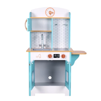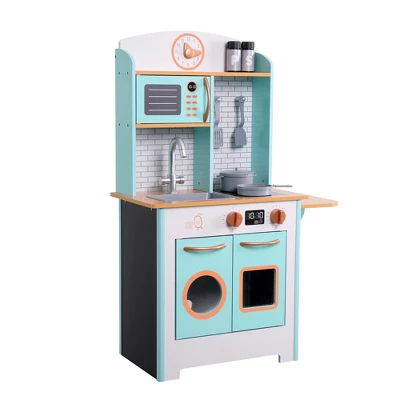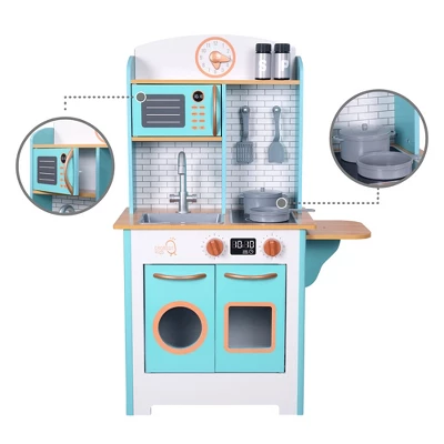 Give your little one their own cooking space with the Teamson Kids Little Chef Santos Kids Kitchen Playset. This retro-style play kitchen features a bright aqua and white finish with natural accents, making it great for boys and girls, and completes any home, classroom, or playroom. The interactive design features three openable oven and microwave doors, two rotating and clicking oven knobs, two printed induction burners, two utensil hooks, two chalkboards, sink with faucet, shelf, and a clock with movable hands to enhance your little one’s play time. With 7 included accessories – plastic pot with lid, pan, two spatulas, plus salt and pepper shakers – this toddler kitchen encourages role play and lights up your little chef’s imagination and creativity. The durable MDF construction is kid-safe and easy to wipe clean from every day messes. The easy-to-follow instructions allow for quick adult assembly so play time can start right away. This kid-sized kitchen measures 24.5″ long, 11.5″ deep, and 36.25″ tall and is recommended for children 3 years and up. Teamson is a global lifestyle home designs brand bringing joy into every home through beautiful, quality pieces made for stylishly comfortable everyday living. Our Teamson Kids brands give flight to fun, discovery and learning through beautifully crafted, safe, and trend-right furniture pieces and toys for kids with a spirit of curiosity and adventure.