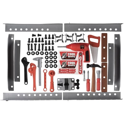 This Tool Set Workbench Is A Great Pretend Play Tool Set For Your Little Builder. The set Will Be An Amazing Substitute For Daddy’s Toolbox, But In A Safer Version. With A Set-Up Workbench, All Tools Will Have Their Set Spot With Easy Access To It. Additionally, The Workbench Can Be Easily Dissembled To Become A Tool Carry Case Where You Can Travel With It All Over. Not Only Will Your Child Be Entertained For Hours With This Awesome Set, But He Will Also Learn About The Purpose Of These Tools Ultimately Broadening His Knowledge To Help Learn And Grow. The Power Drill Is Just Like The Real Thing, Its Real Working Machine With drill Sounds. 2 AA Batteries Needed (Not Included); Set Includes Nuts And Screws Accessories As Well As Many Popular Tools.